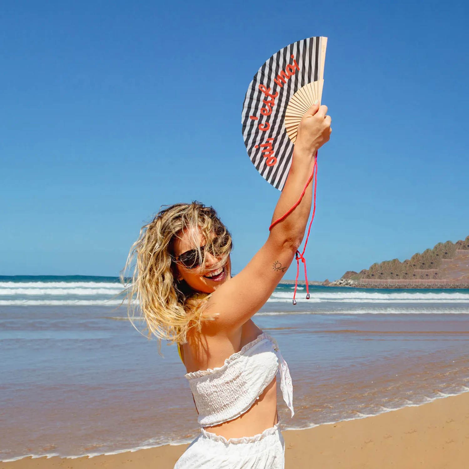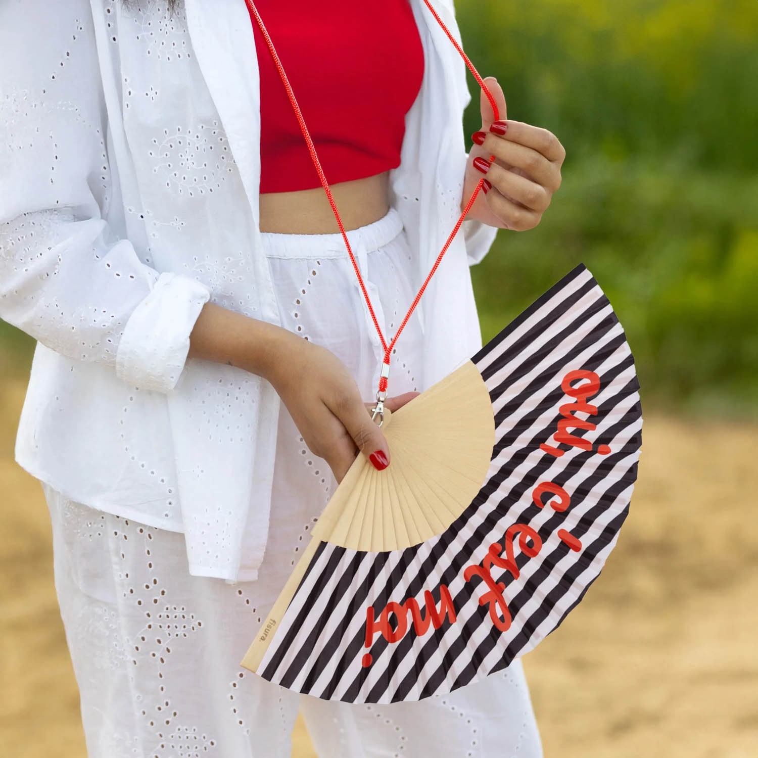 Esprimi sicurezza con questo ventaglio d'ispirazione francese con la scritta "OUI, C'EST MOI". Ogni movimento di questo ventaglio è una dichiarazione di autostima.