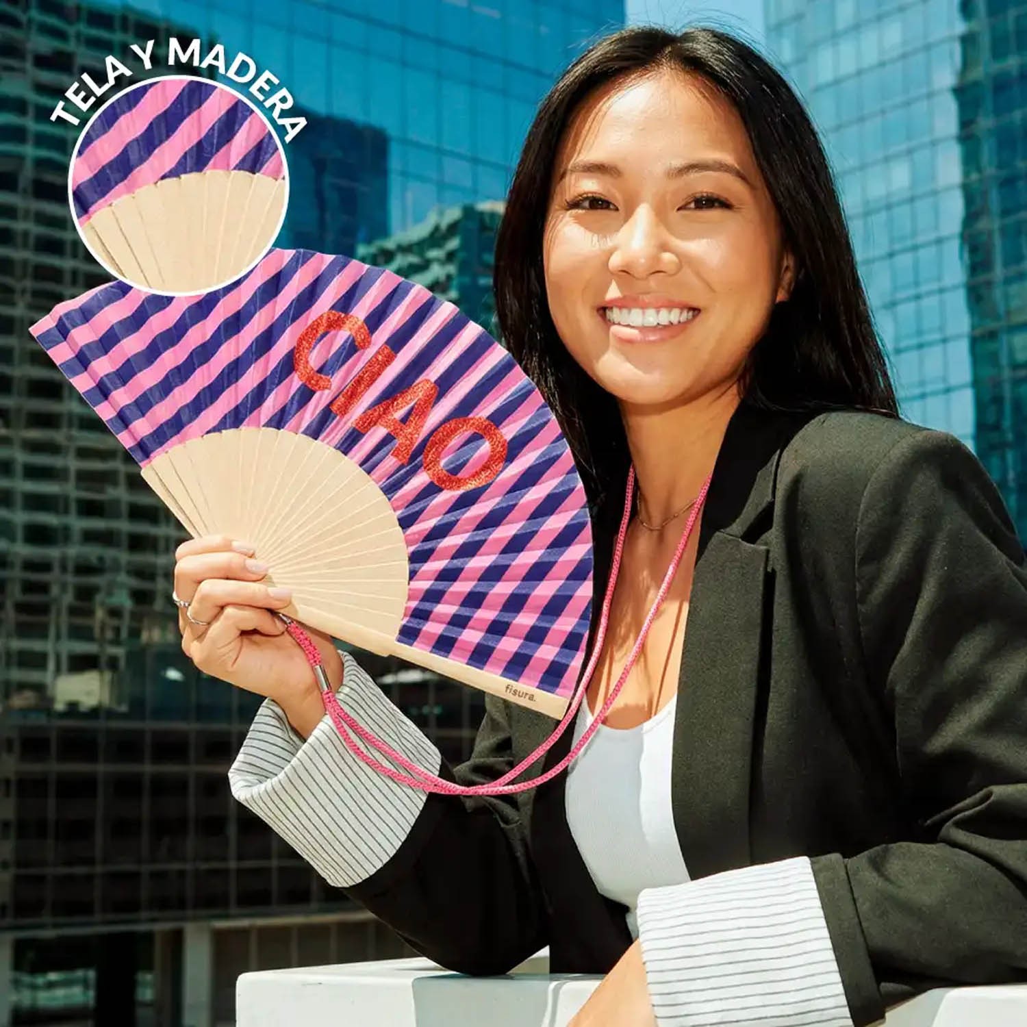 Ventaglio "CIAO" a righe rosa e blu