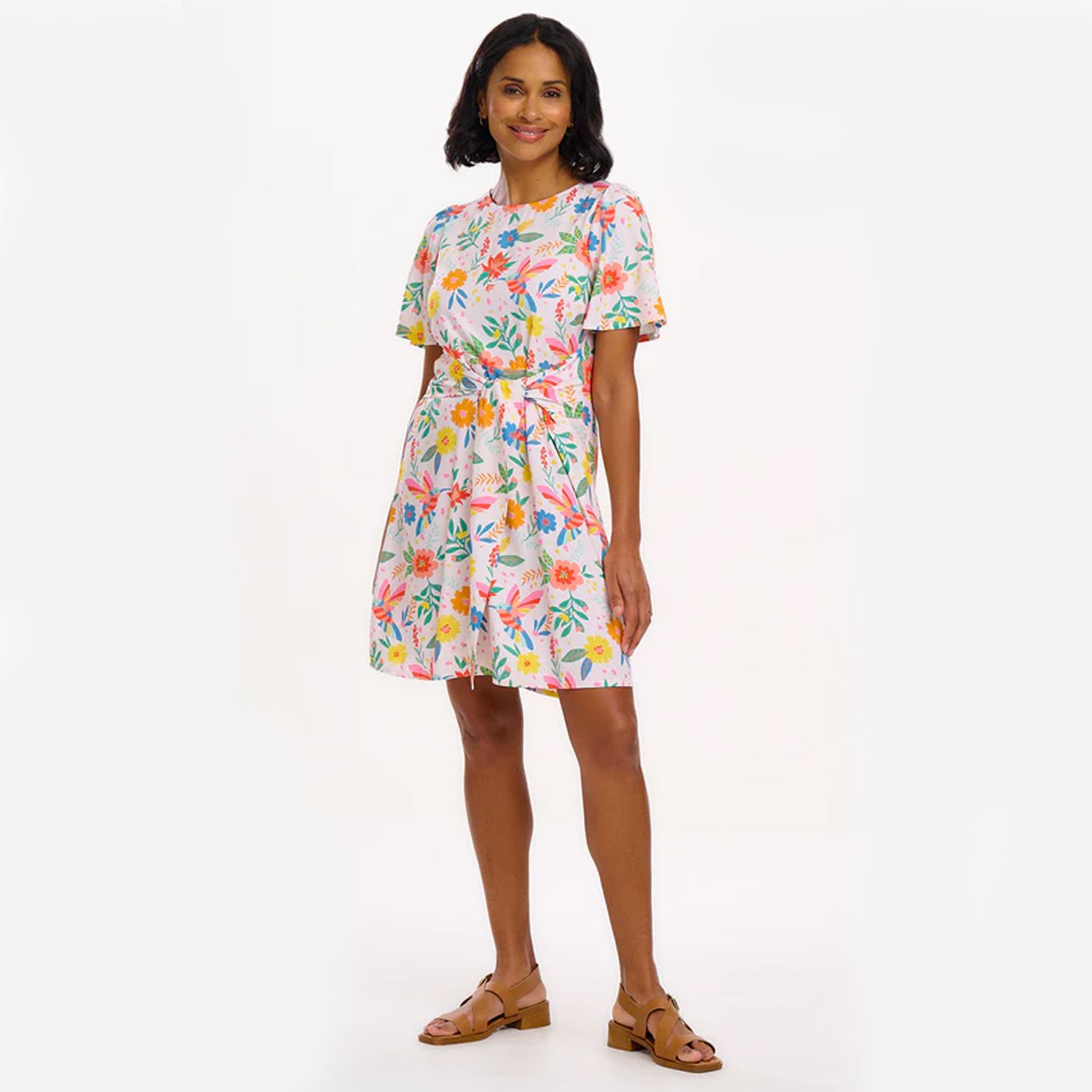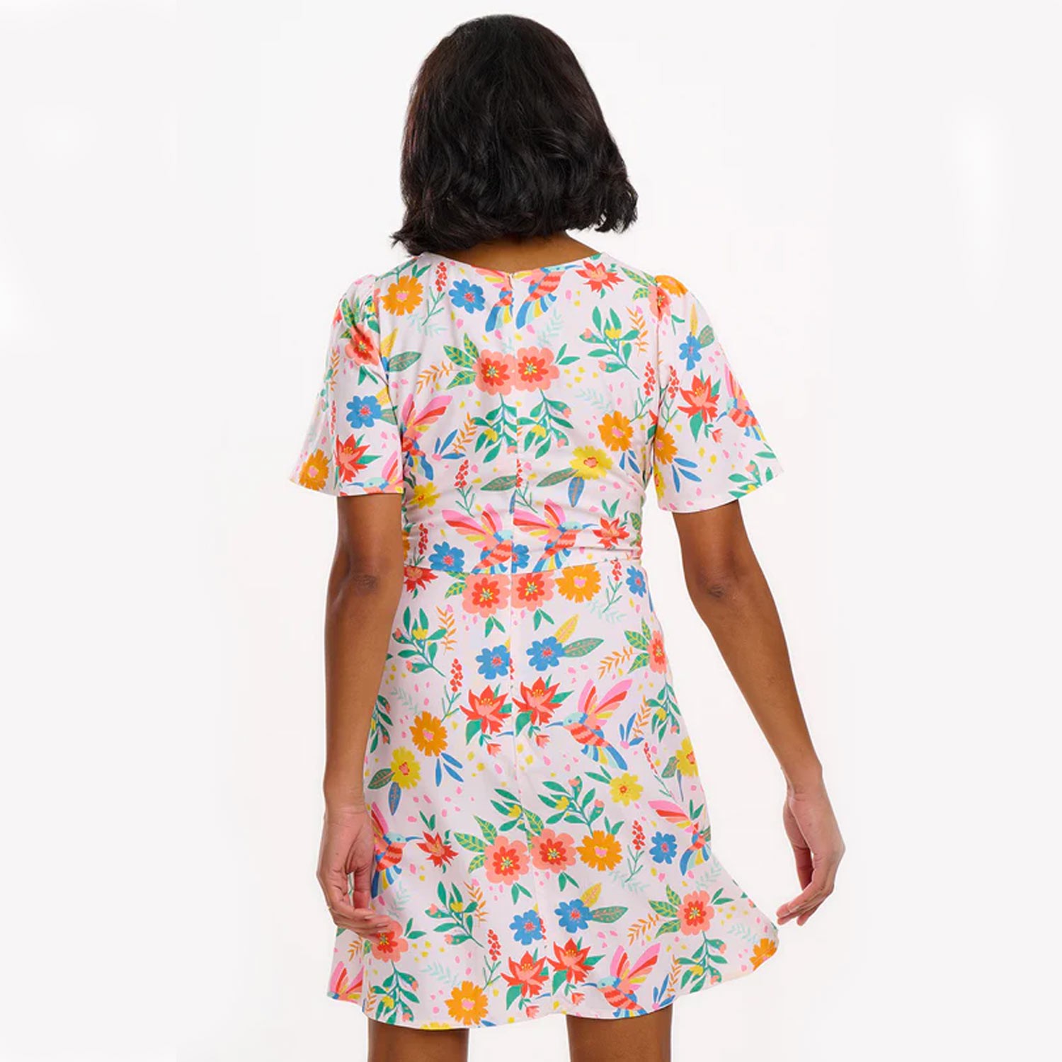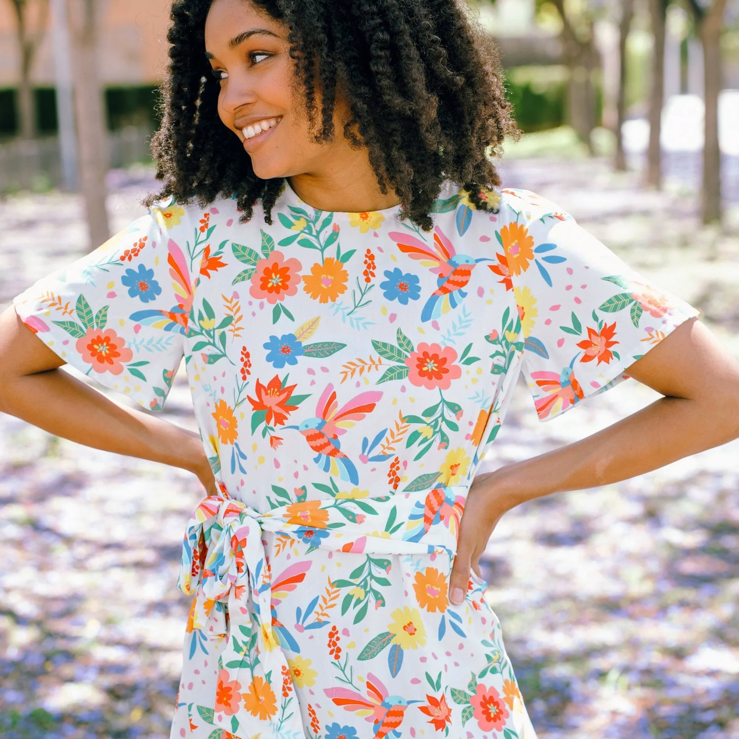 Questo mini abito presenta una scollatura arrotondata e una cintura da annodare, davanti o dietro a seconda delle proprie preferenze, completata da eleganti maniche a palloncino. Presenta la nostra vivace stampa Tropical Hummingbird, decorata con fiori colorati e colibrì su uno sfondo bianco sporco. Perfetto per un outfit primaverile-estivo.