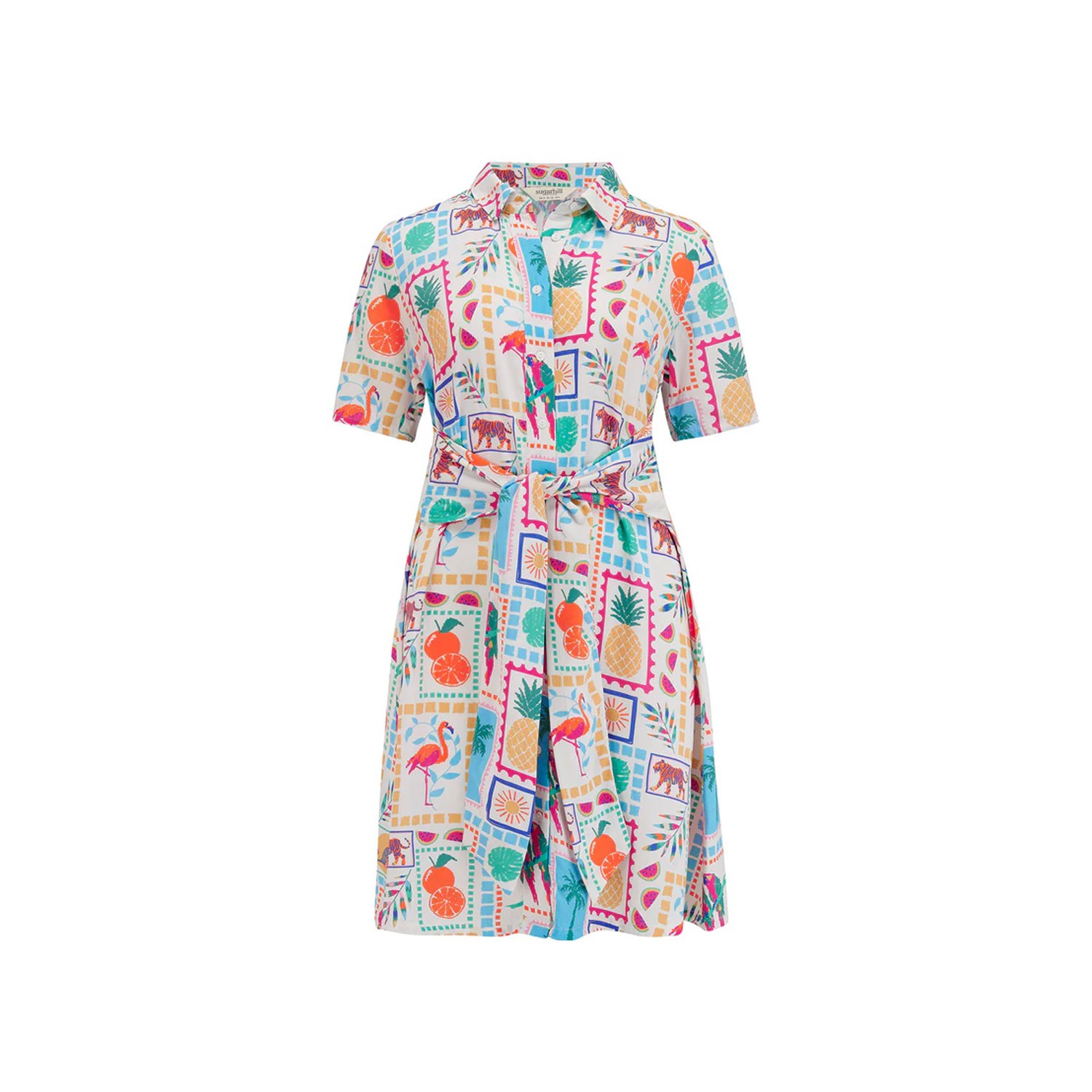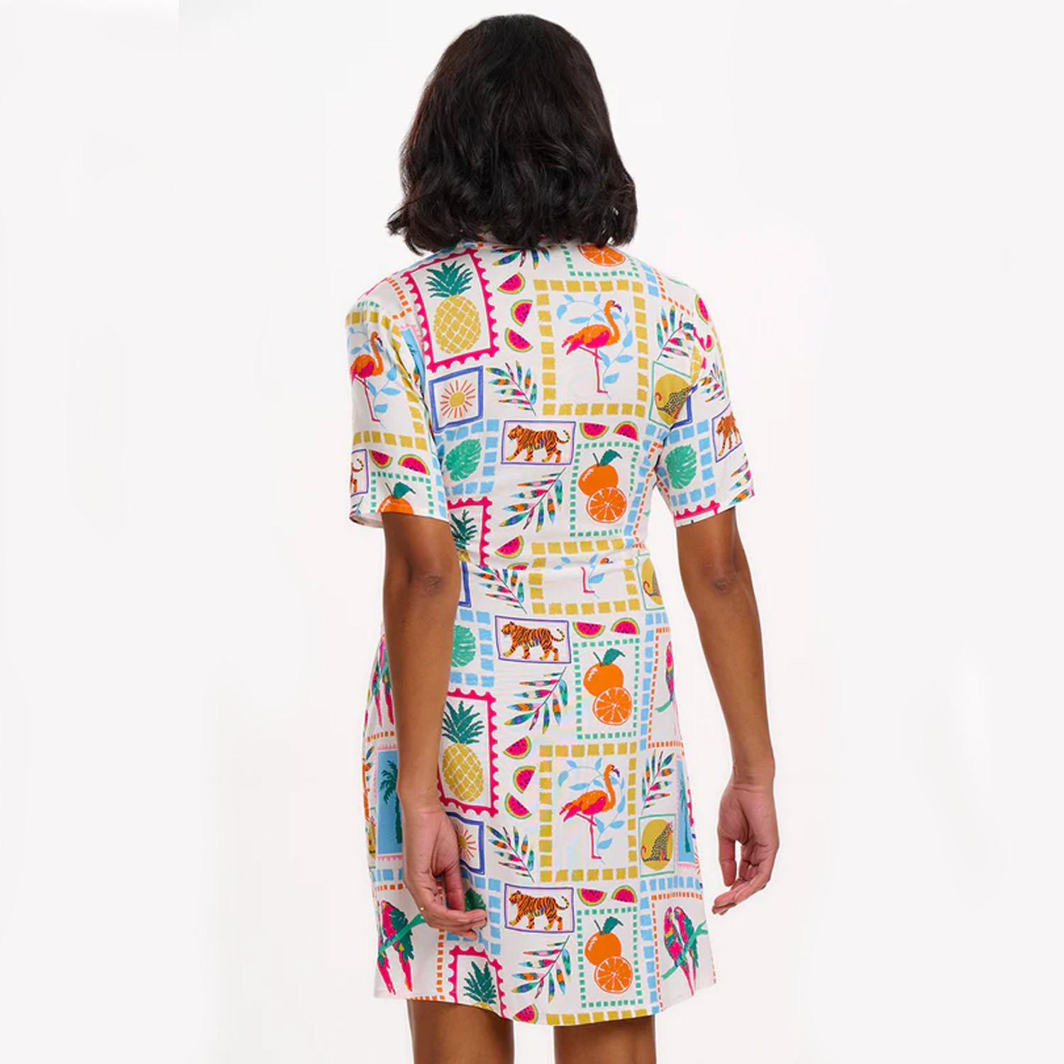 Questo mini abito è una rivisitazione del classico abito chemisier, con abbottonatura frontale, colletto a camicia rilassato, maniche corte e una graziosa cintura con nodo frontale per creare una vestibilità perfetta. Abbiamo creato questo stile con una gonna più corta, ideale per le giornate più calde e una base bianca ideale per la nostra splendida stampa estiva Jungle Tile.