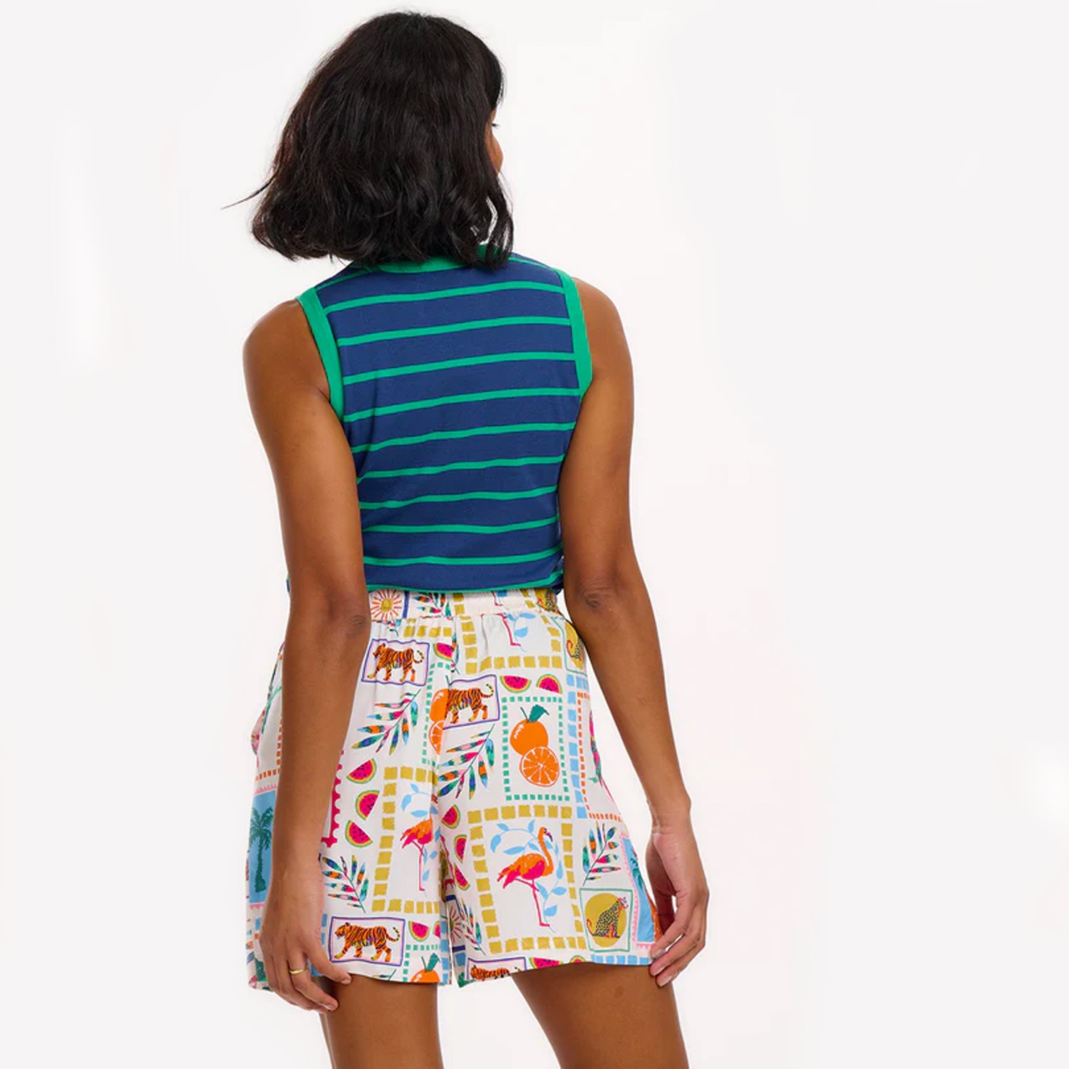 Questi pantaloncini saranno il tuo capo preferito per l'estate, con elastico in vita e una comoda cintura con coulisse per il massimo comfort, oltre a pratiche tasche. Si distingue per la nostra ultima stampa Jungle Tile, che mostra un colorato collage tropicale di animali selvatici, frutta e piante su una base bianco sporco. Realizzati in 100% LENZING™ ECOVERO™ Viscosa. Lavabile in lavatrice (delicato).