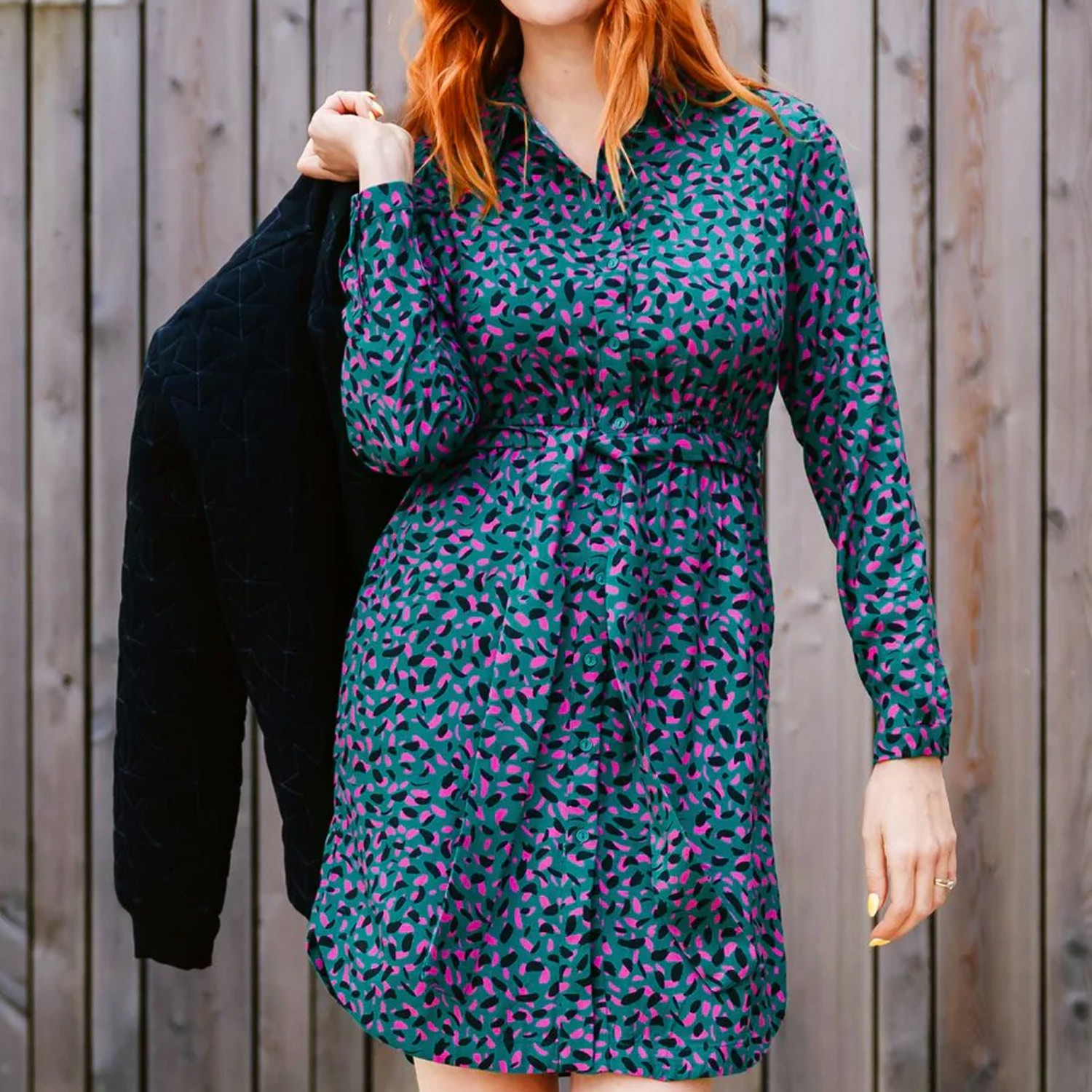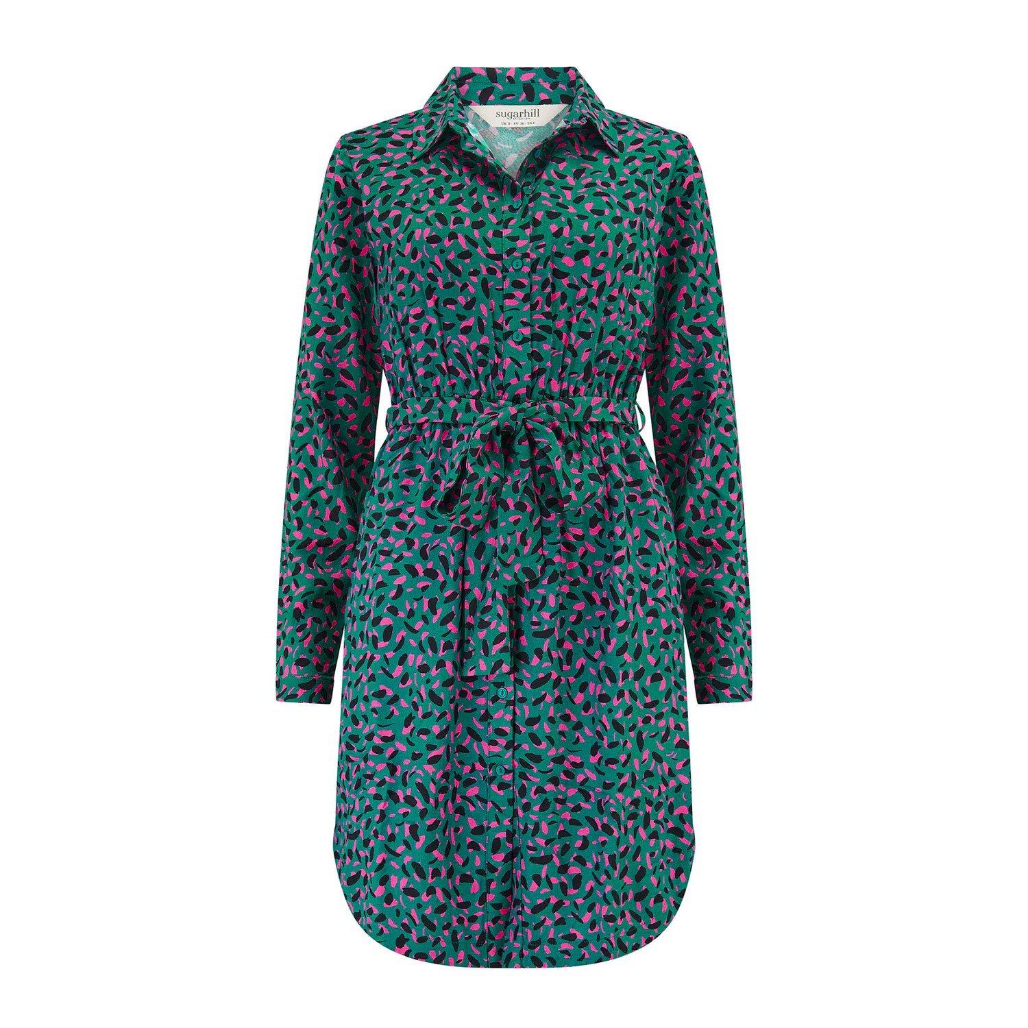 Porta un'energia audace al tuo guardaroba con il mini abito-camicia Georgia. Questo accattivante capo presenta una stampa astratta di ispirazione leopardata, con pennellate nere e rosa su una base verde acqua. Realizzato in un pesante tessuto Rayon Twill, ha tutti i dettagli che ami: colletto classico, abbottonatura frontale, coulisse in vita per una vestibilità impeccabile e, sì, tasche! Facile da abbinare, è una rivisitazione divertente di un capo essenziale per tutti i giorni.