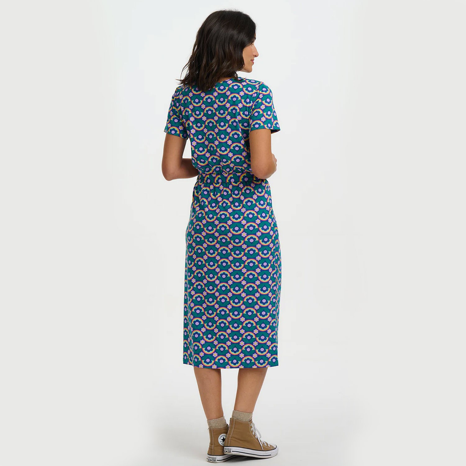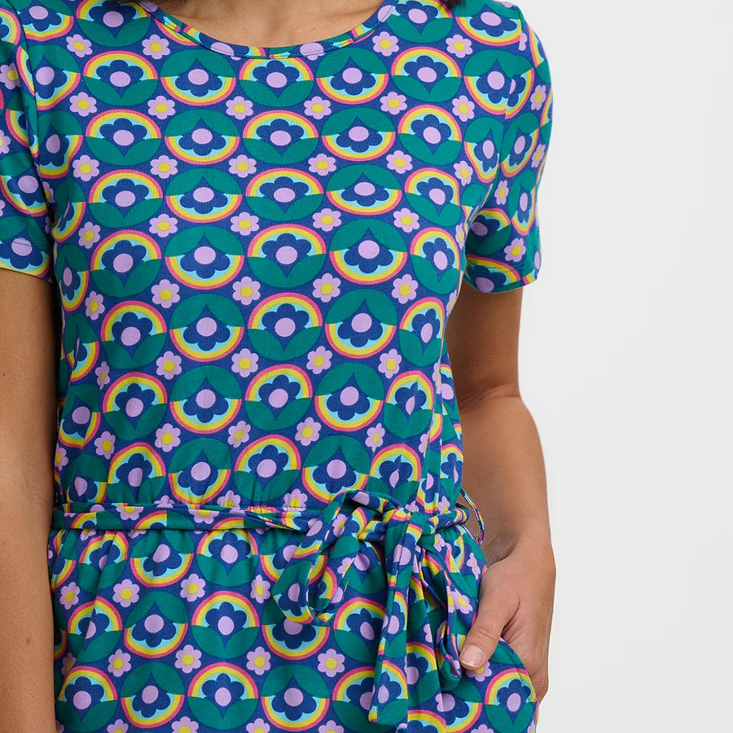 L'abito unisce comfort e stile con la sua comoda t-shirt, le pratiche tasche e la cintura coordinata che definisce il punto vita. Con una lunghezza midi che valorizza la figura, è rifinito con archi floreali retrò ripetuti nei colori dell'arcobaleno che creano un motivo geometrico audace e giocoso su sfondo blu navy dall'atmosfera molto anni '70. Gonna con spacchi laterali.