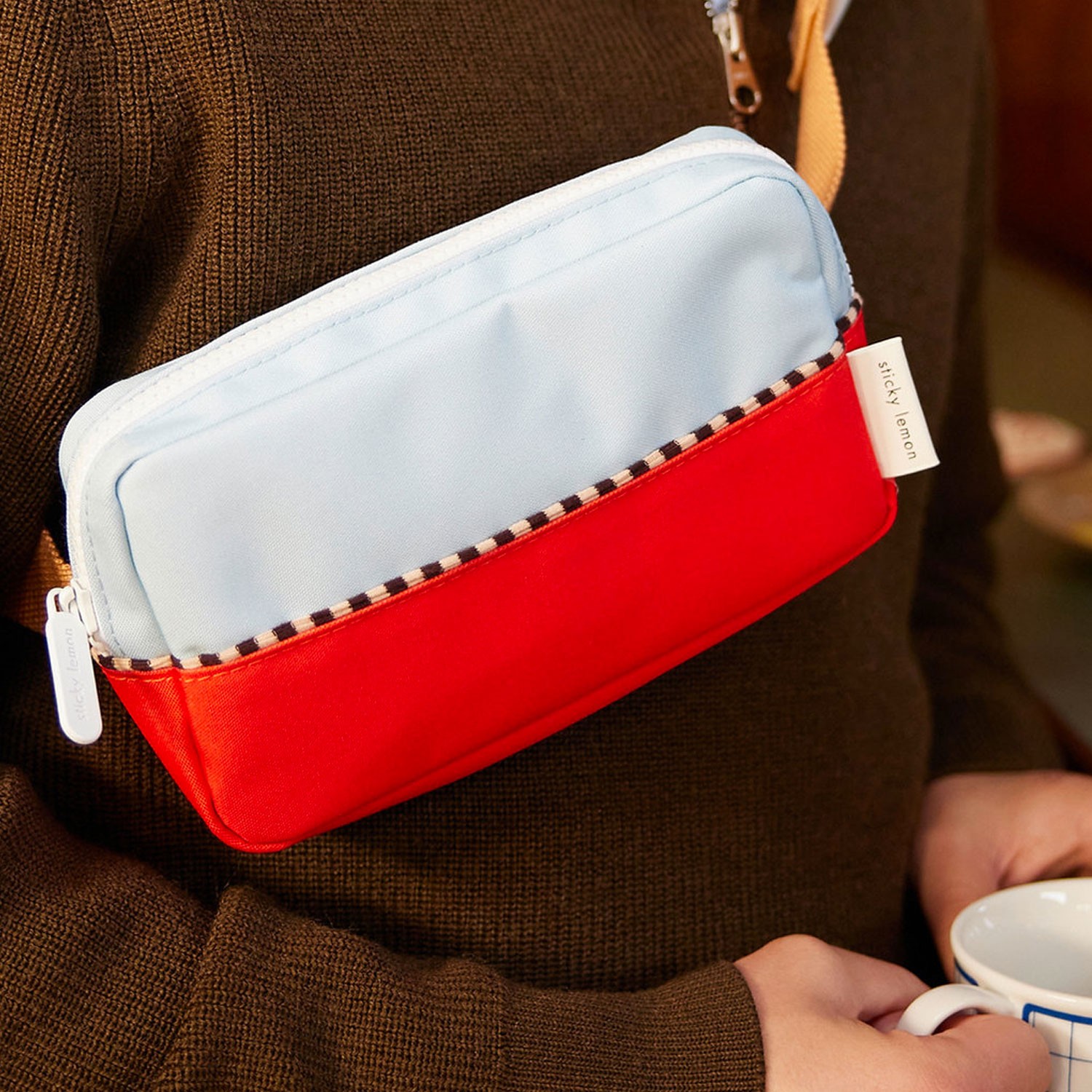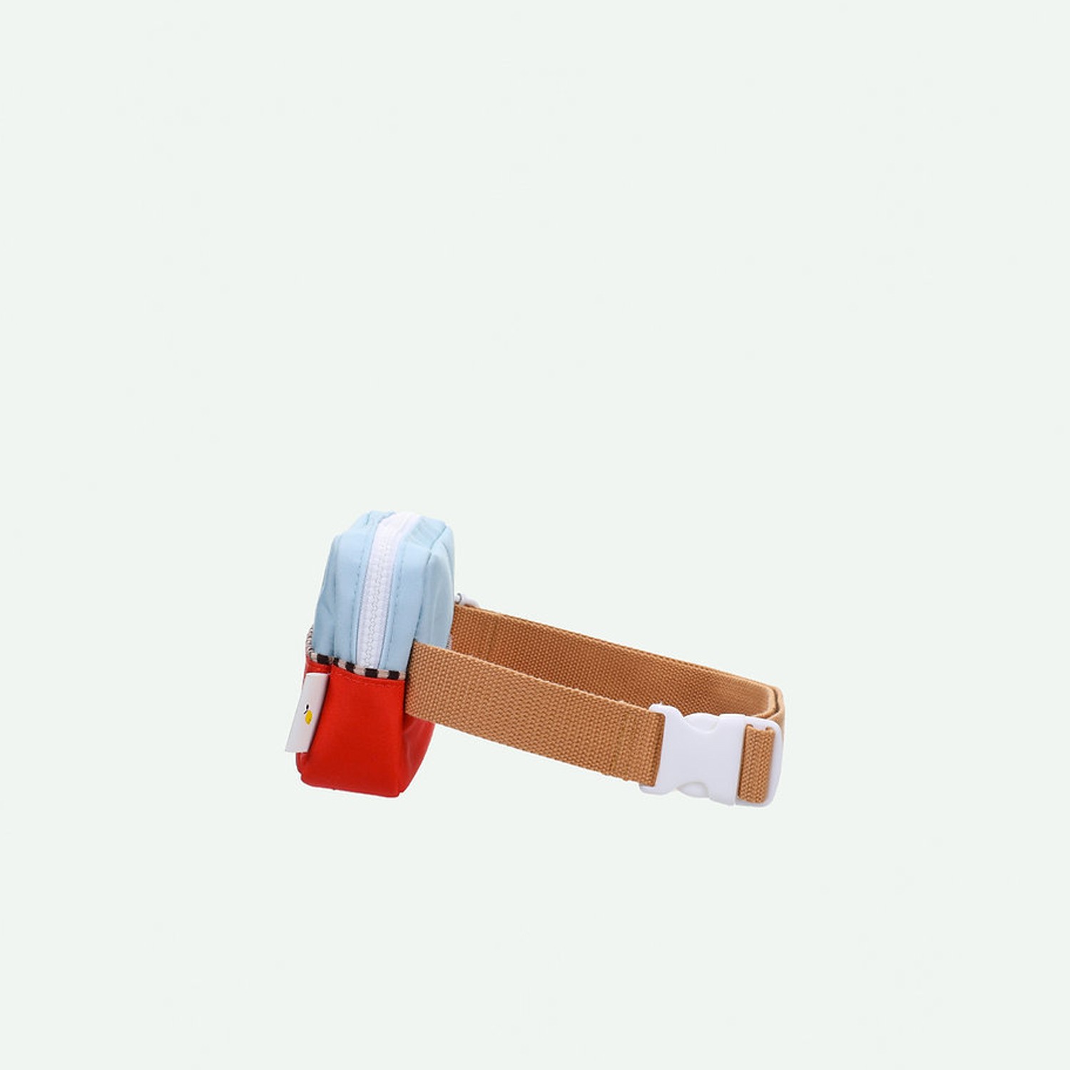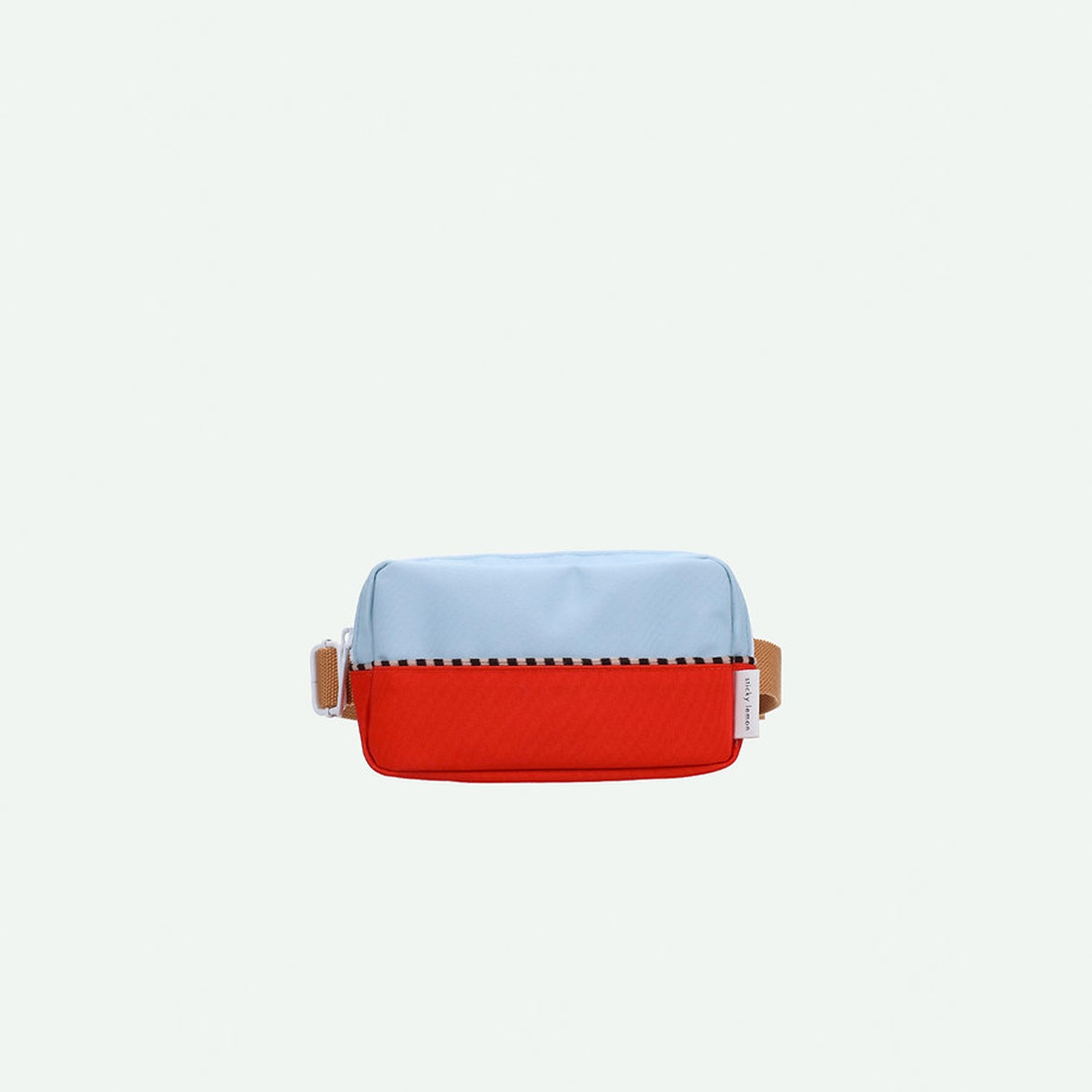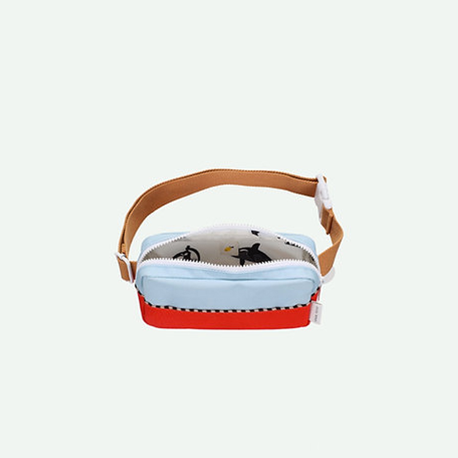Tieni i tuoi accessori sportivi a portata di mano in questo marsupio bicolor, azzurro pastello e rosso, realizzato con bottiglie in PET riciclate, dotato di vano interno e di tasca frontale con cinturino color moka regolabile, che lo rende perfetto e pratico da utilizzare anche a tracolla. Viene fornito con una fodera interna impermeabile bianca con fantasia a tema marino e con cerniere YKK di alta qualità assieme ad una comoda targhetta dove inserire il proprio nome.