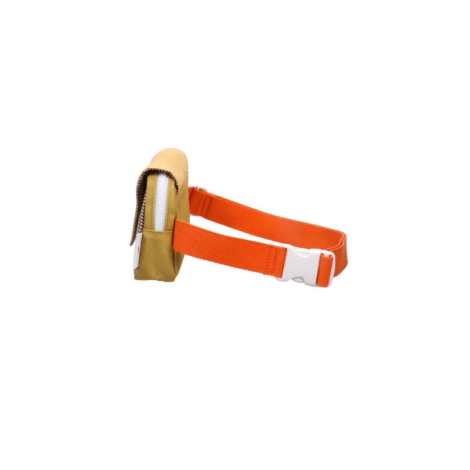 Progettato per chi ama la praticità senza rinunciare allo stile, questo accessorio è perfetto per custodire i piccoli tesori quotidiani, che sia durante una gita scolastica, una passeggiata in città o un festival. Il corpo dello zaino sfoggia una tonalità verde senape che si sposa perfettamente con l'iconica tasca frontale. La patta gialla ocra protegge una base con motivo a quadretti nei toni del marrone, creando un look vintage e intramontabile. Grazie alla cintura arancione regolabile robusta, può essere indossato in vita per un look classico o a tracolla per uno stile più urban e moderno. Non farti ingannare dalle dimensioni compatte, l'interno è rivestito con una fodera impermeabile illustrata, garantendo che smartphone, chiavi o portafoglio restino all'asciutto anche in caso di pioggia leggera. La chiusura principale con zip bianca a contrasto assicura il contenuto, mentre il bottone a pressione sulla tasca frontale permette un accesso rapido agli oggetti più piccoli.
