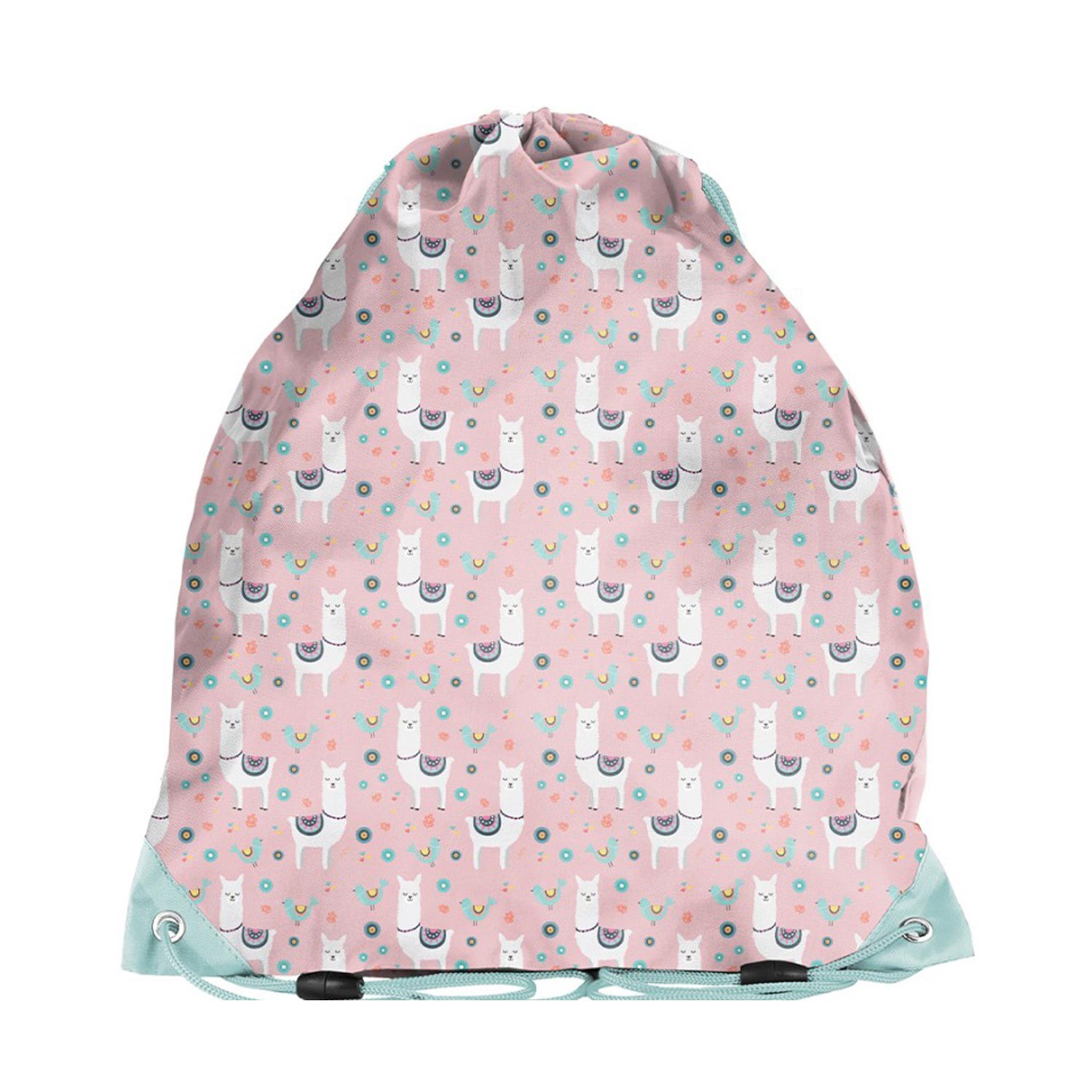 Sacca di colore rosa con simpatica fantasia a tema lama all-over, decorata con arcobaleni e fiorellini! Realizzata in poliestere con un unico scomparto, questa sacca-borsa prevede una vasta gamma di usi: perfetta come borsa porta scarpe, abbigliamento da palestra o come piccolo zainetto. Il modello si chiude con un doppio laccetto verde adattabile come tracolla, che ti consente di portare la sacca sulla schiena o sulla spalla.