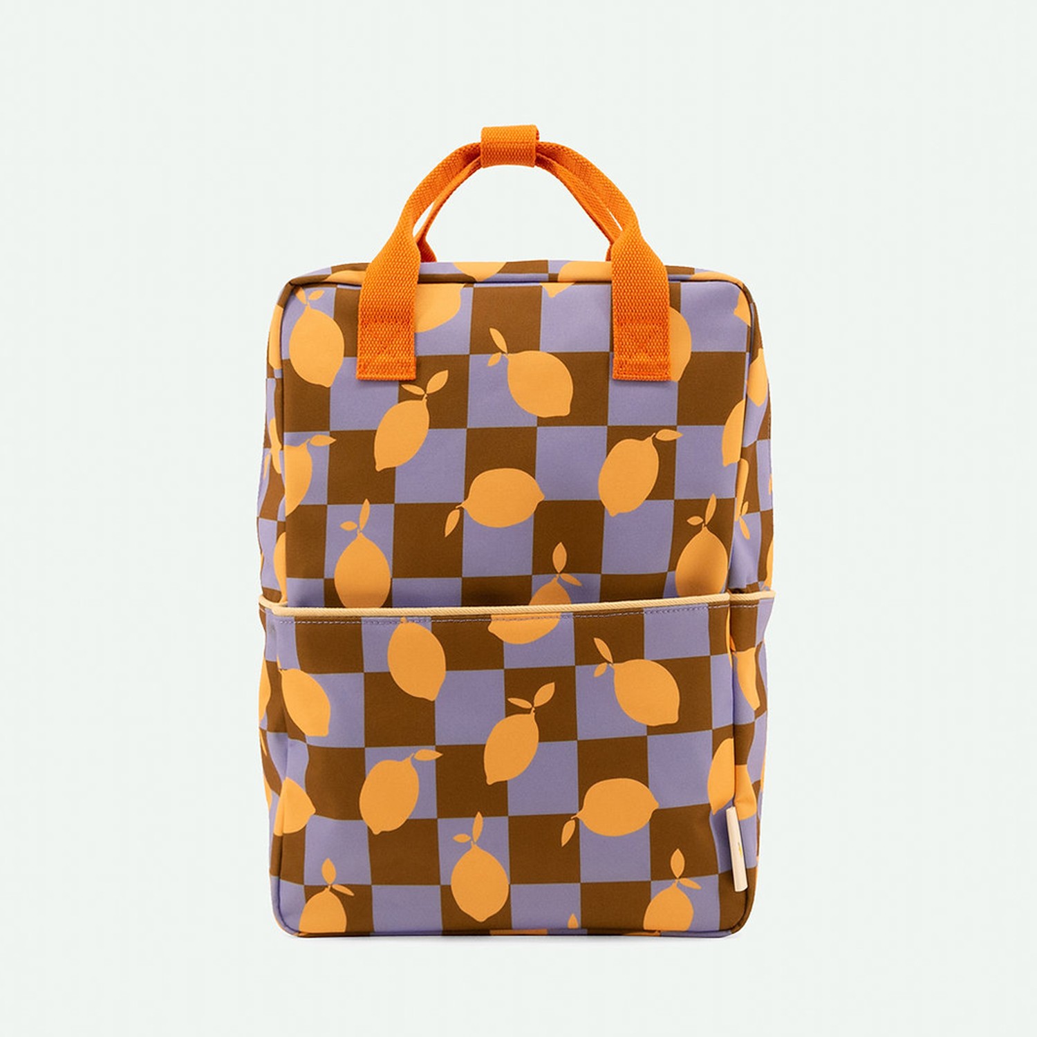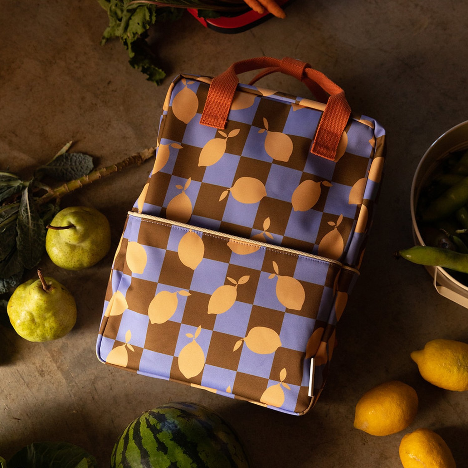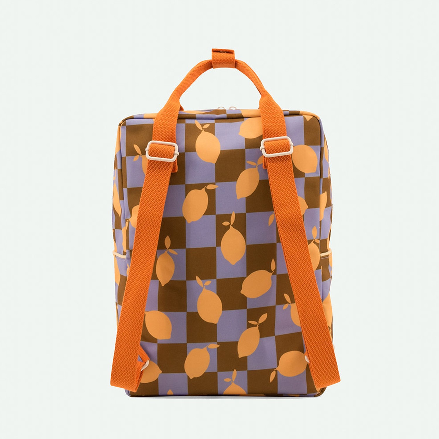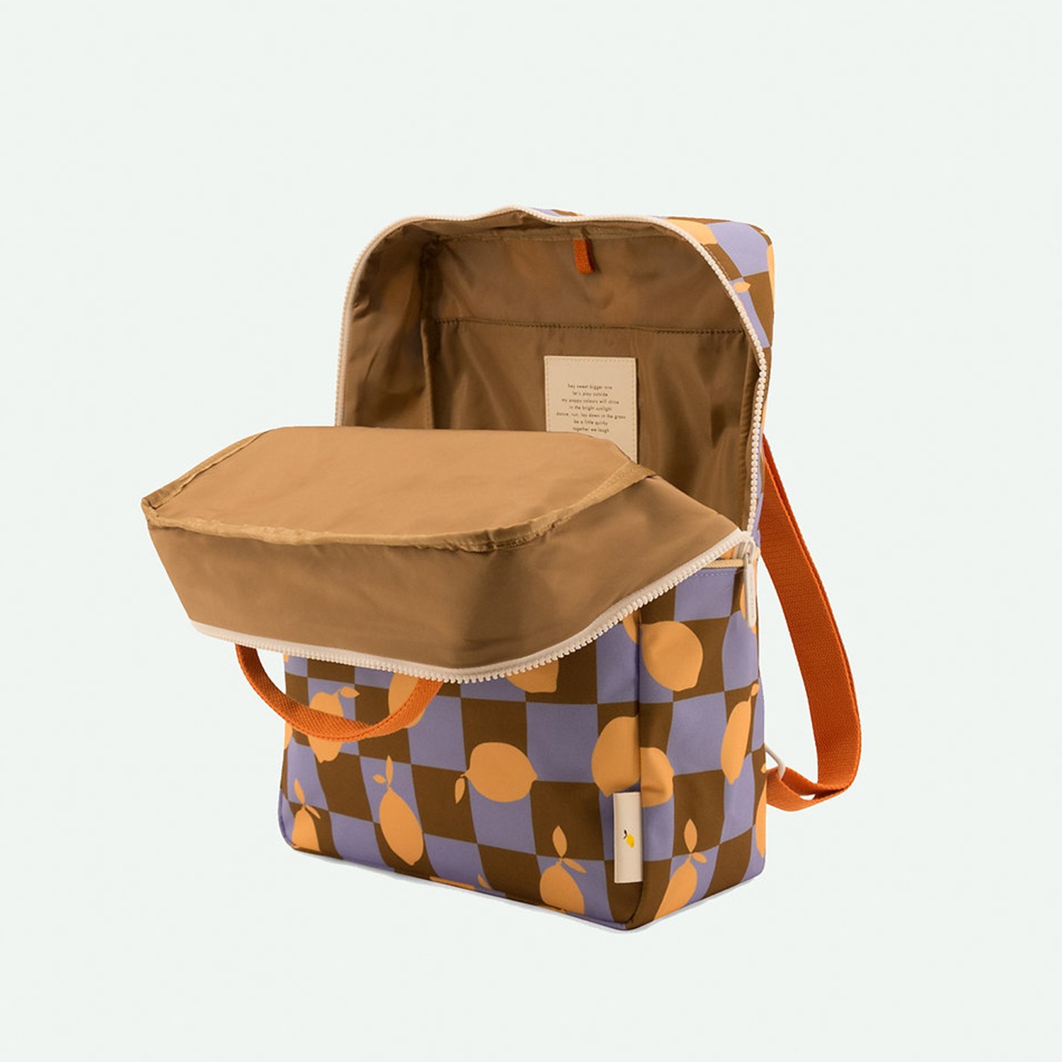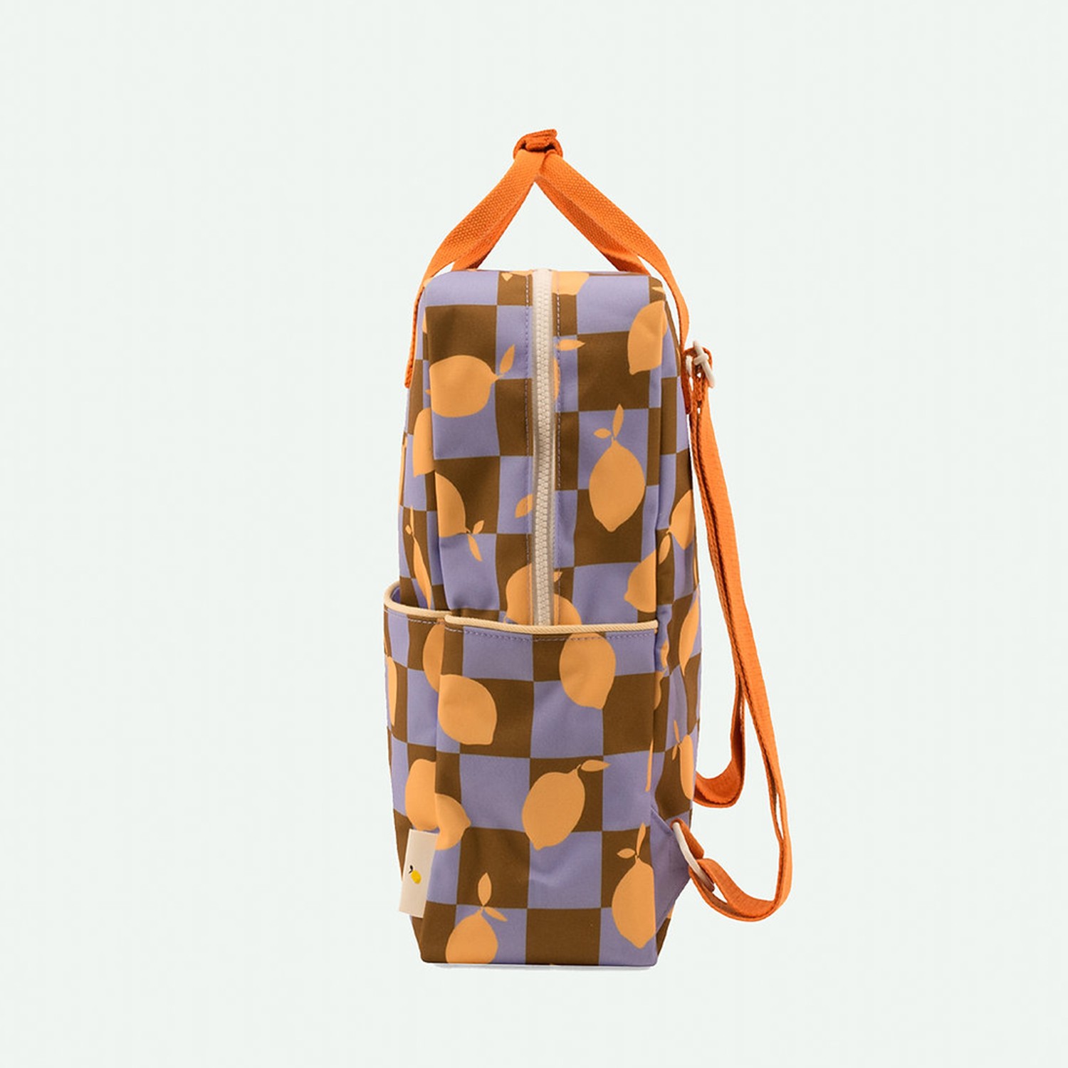 Questo zaino con simpatica fantasia a quadretti viola e marroni abbellita da limoni, è realizzato con bottiglie in PET riciclate ed ha la certificazione Global Recycled Standard. Sul fronte è presente una tasca extra con zip. La fodera beige interna è impermeabile, mentre le cerniere sono YKK e le maniglie sulle spalline sono regolabili. All'interno, inoltre, trovi un elastico porta bottiglia e una tasca su tutta la schiena che si chiude con velcro. Sulla targhetta portanome puoi scrivere tutti i riferimenti del tuo contatto. Cinghie in cotone arancione con fibbie in metallo bianco.