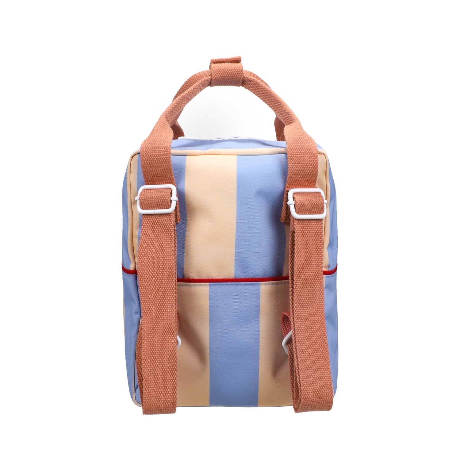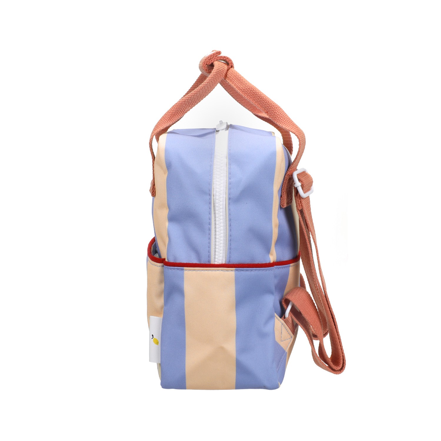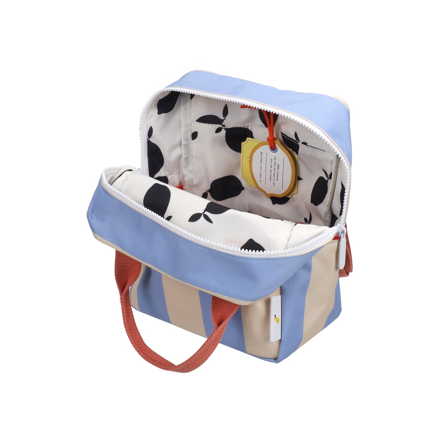 Questo zainetto bimbo Sticky Lemon si veste di una freschissima fantasia a righe larghe, perfetta per chi cerca un accessorio pratico ma ricco di personalità. In questa versione, il delicato contrasto tra l'azzurro cielo e il beige crea un'estetica rétro-chic e rassicurante, ideale per la scuola materna, le prime classi delle elementari o per il tempo libero all'insegna del buonumore. Un'alternativa sofisticata e allegra ai modelli tinta unita. Le righe larghe donano un senso di ordine e vivacità, completate dai manici color corallo che aggiungono un tocco di colore caldo e divertente. Il vano principale è spazioso e facile da riempire per ospitare il cambio, la merenda o i giochi. All'interno è presente un pratico elastico per tenere la borraccia verticale ed evitare fuoriuscite accidentali. Uno scomparto sulla schiena con chiusura in velcro, perfetto per piccoli libri, quaderni o disegni importanti. Realizzato in tessuto tecnico riciclato robusto e facile da pulire, vanta una fodera impermeabile interna illustrata a mano che protegge il contenuto da pioggia e piccoli incidenti. Spallacci regolabili resistenti per adattarsi alla crescita del bambino e maniglie superiori in contrasto con clip di chiusura, per un comodo trasporto a mano.